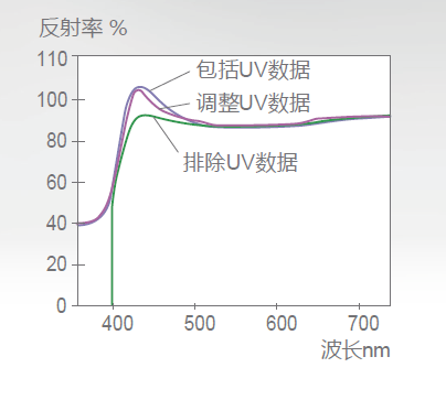 想要準(zhǔn)確測(cè)量用熒光增白劑(FWA)處理過的紙或布等材料,需要精確控制UV含量及其影響。CM-36dG和CM-36dGV所用的數(shù)字UV控制方式能夠通過合適的計(jì)算將兩種氙燈(一種具有完整的UV能量,另一種具有通過400 nm或420 nm UV截止濾光片去除UV能量)的閃光結(jié)果結(jié)合起來進(jìn)行控制。此種方法無需進(jìn)行機(jī)械的濾光定位,通過白度指數(shù)、色調(diào)、亮度或UV配置等進(jìn)行UV調(diào)整。