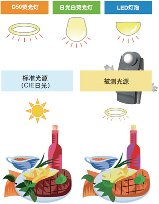 除了熒光燈,最近LED(發(fā)光二極管)也已被用作照明燈。物體在這些光源下顯示的色貌與其在自然光下原色貌進行比較,兩者的接近程度就是光源的"顯色性"。