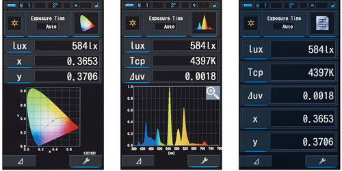 | 色彩顯示模式 | 相關(guān)色溫Tcp、與黑體Δuv的差異、XYZ、xy、u'v'、特征波長(zhǎng)λd、色純度Pe、光譜輻射照度、EV、CRI(Ra、Ri)、峰值波長(zhǎng)λp、曝光值 |